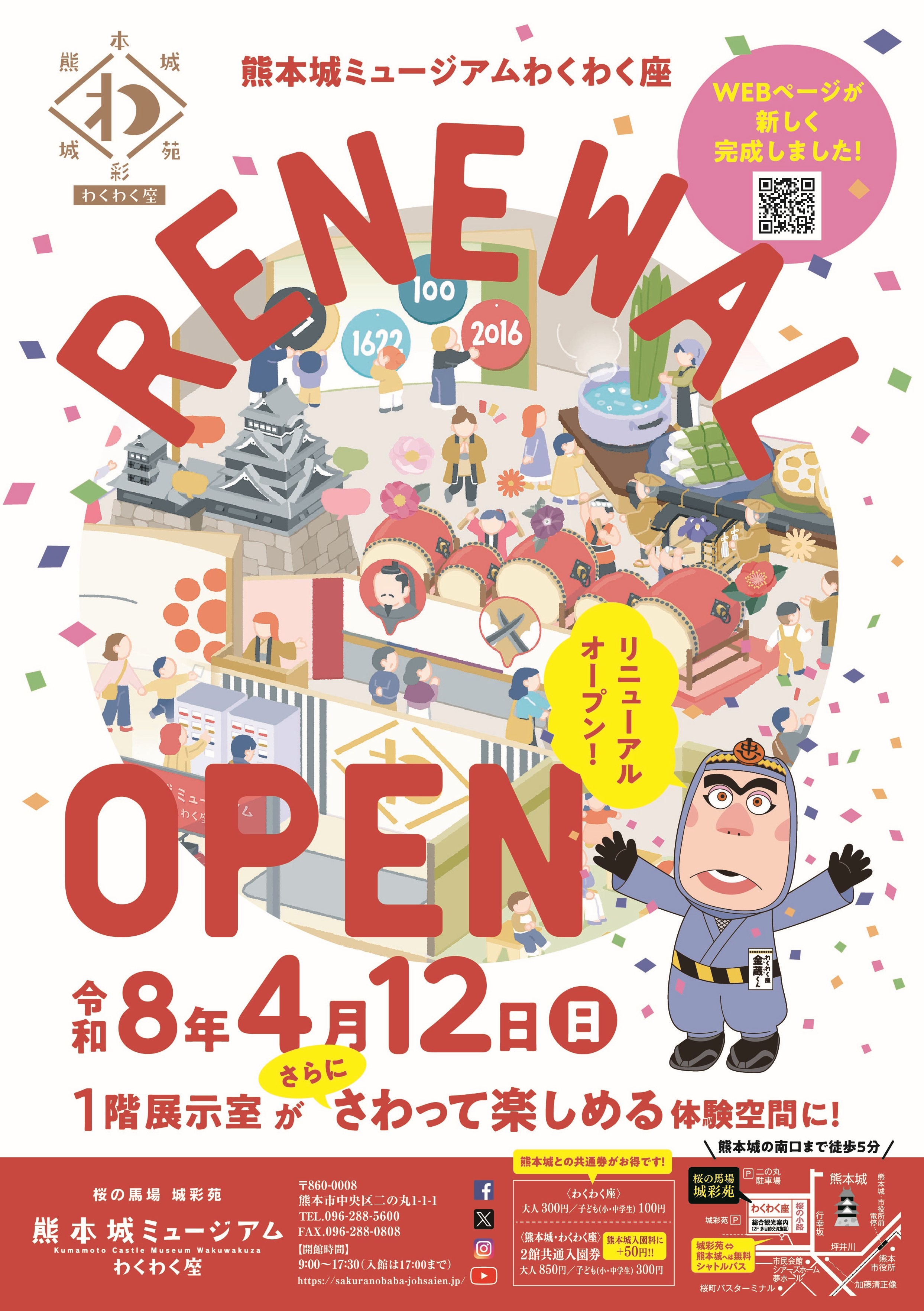 さてこの度、4月12日(日)に 熊本城ミュージアムわくわく座は、リニューアルオープンをいたします。本年は熊本地震から10年という大きな節目の年にあたり、この節目を機に、より多くの皆さまに、これからも長く親しんでいただける施設へと進化してまいります。