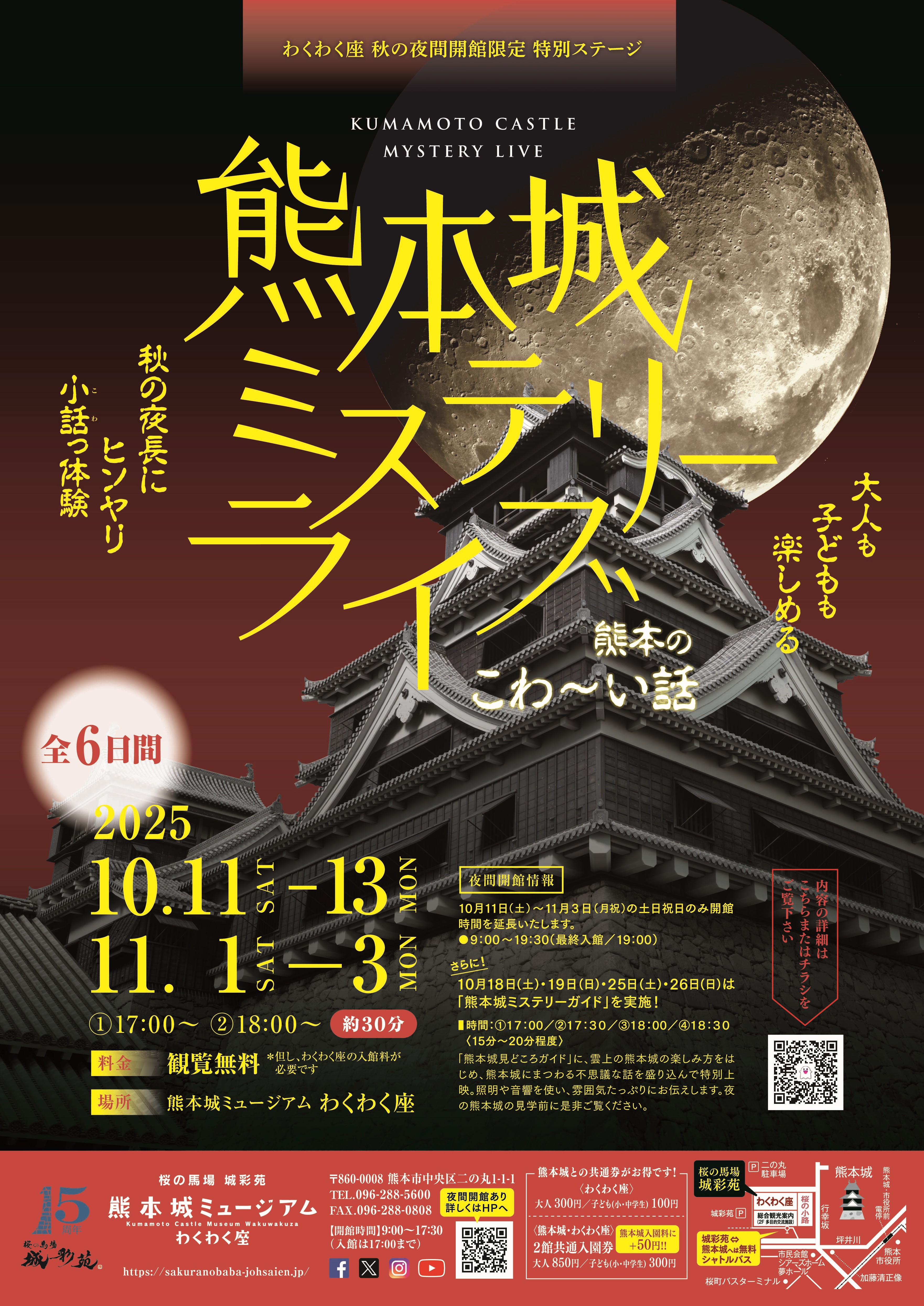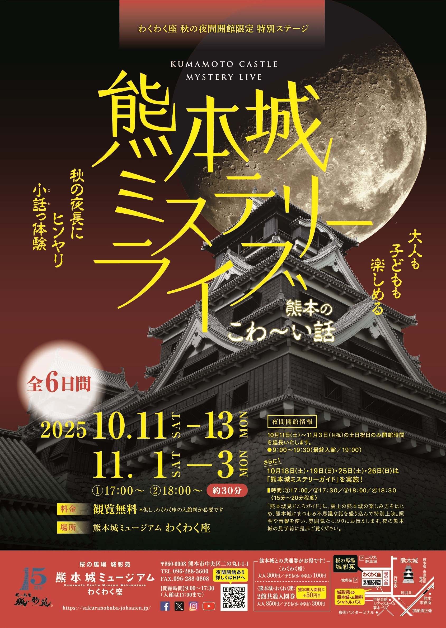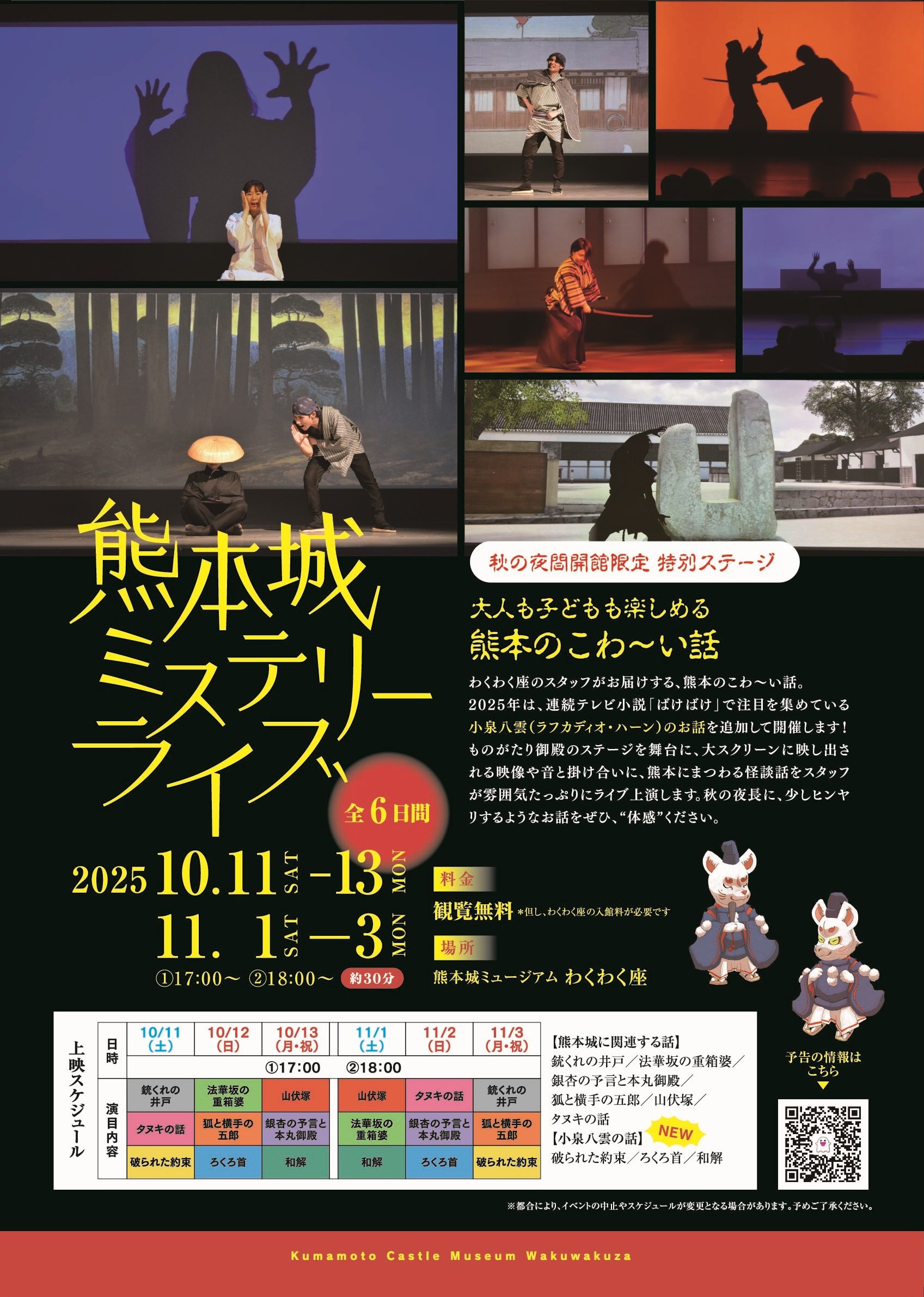 ものがたり御殿のステージを舞台に、大スクリーンに映し出される映像や音と掛け合いに、熊本にまつわる怪談話をスタッフが雰囲気たっぷりにライブ上演します。熊本城の見学とあわせて、秋の夜長に少しヒンヤリするようなお話をぜひ、“体感”ください👻